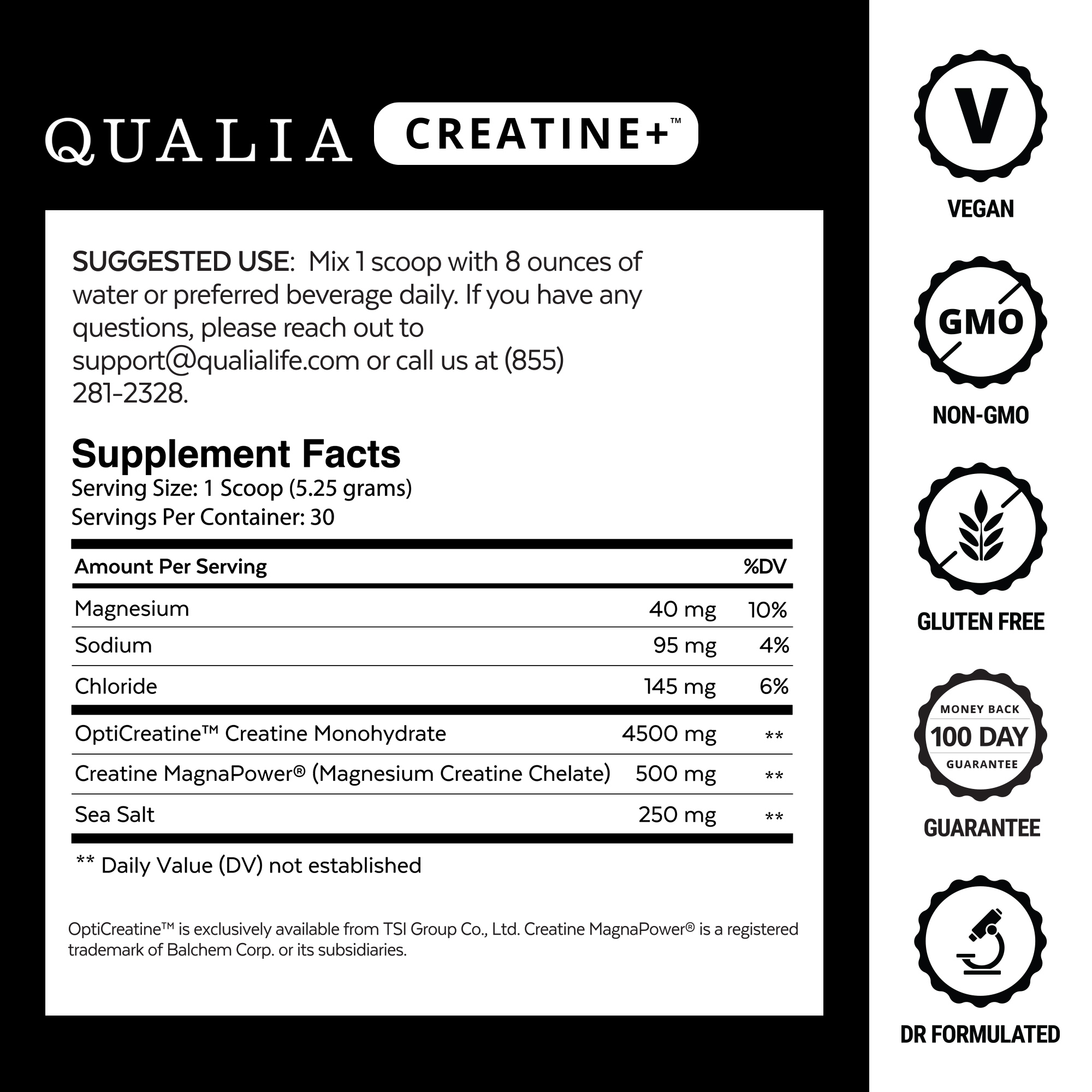 Both Creatine MagnaPower® and OptiCreatine™ creatine monohydrate are clinically studied forms of creatine. Qualia Creatine+ is also vegan, non-GMO, gluten-free, and 3rd party tested to ensure the highest standards.