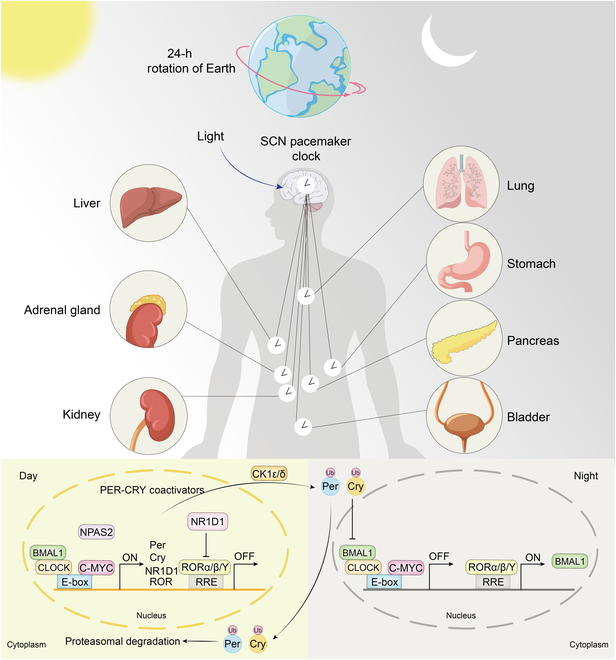 In humans, the master rhythm originates in the suprachiasmatic nucleus (SCN), a tiny cluster of neurons in the hypothalamus that receives light and dark signals through the eyes. In response to these cues, the SCN sends signals that reverberate outward to every tissue, syncing peripheral clocks so physiology stays coordinated [7].